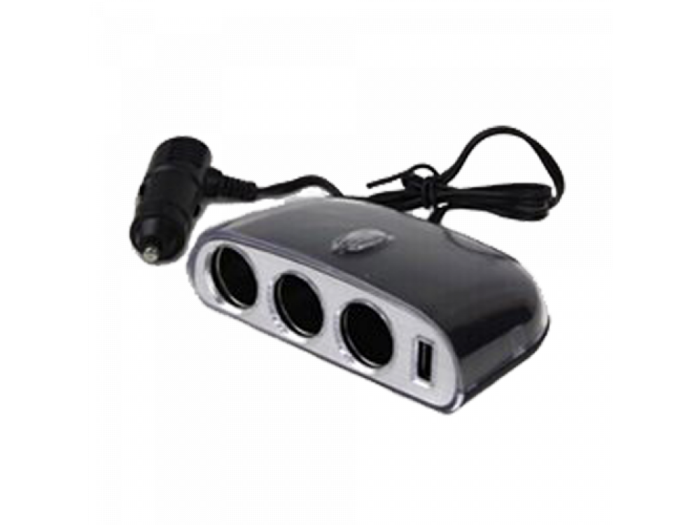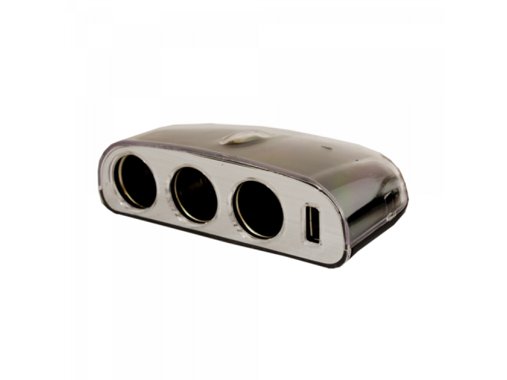 Разветвитель гнезда прикуривателя (12/24 В), на три входа с максимальным суммарным током нагрузки 5 А + зарядное устройство с USB входом (5 V / 1000 mA).