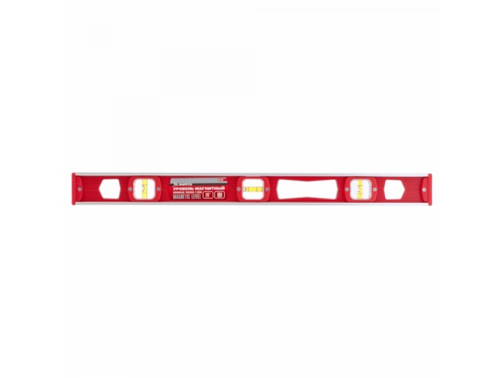 Корпус уровня изготовлен из ударопрочной пластмассы с алюминиевым каркасом. В корпус инструмента встроены магниты для фиксации на металлических поверхностях. Модель имеет три акриловых глазка для проверки отклонений по горизонтали и вертикали. Точность измерений – 1 мм м (0,057 градуса).
